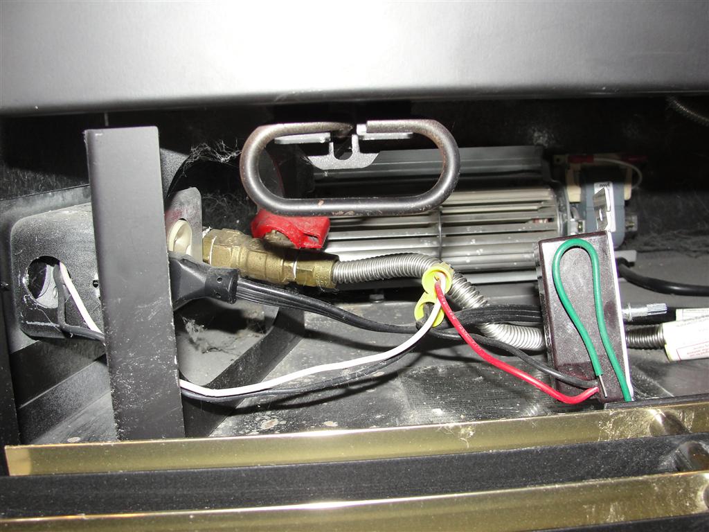 Does everything look good under the hood? Most gas fireplaces have a small access door that swings up to access the gas valve, pilot controls, and wiring. The photo below shows open-spliced wiring where someone improperly installed a fan motor control.