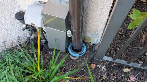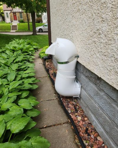 Dryer duct, snorkel, penguin. This is a snorkel-style dryer duct to get above grade, wrapped with insulation to minimize condensation. The homeowner affectionately referred to it as their penguin.