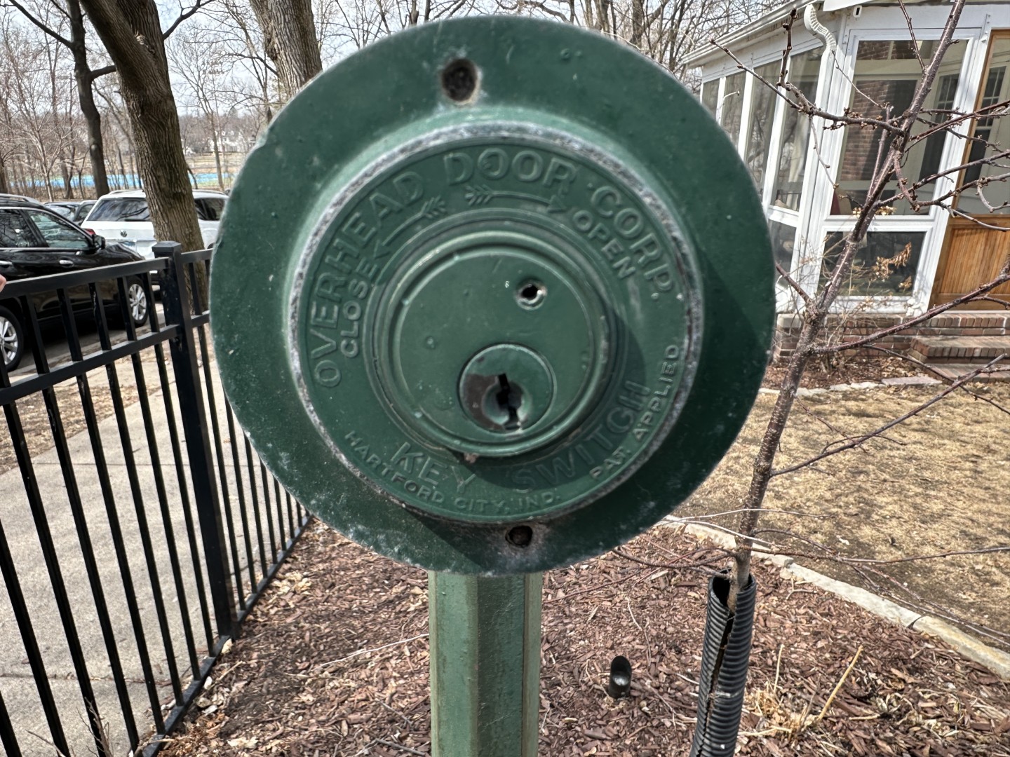Old-school garage door opener remote. Before we had remotes for garage doors, we had this. You pull your vehicle up, put the key in the thing, and your overhead door opens. Beautiful.
