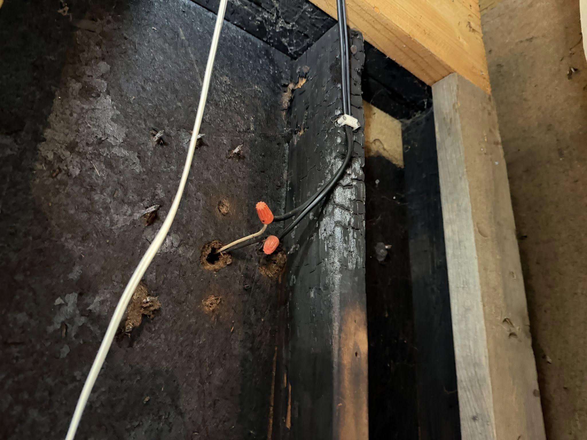 Let’s try that again – there was clearly a fire in this wall. And now there’s new, open spliced wiring in the wall, which is clearly a fire hazard. One fire just wasn’t enough?