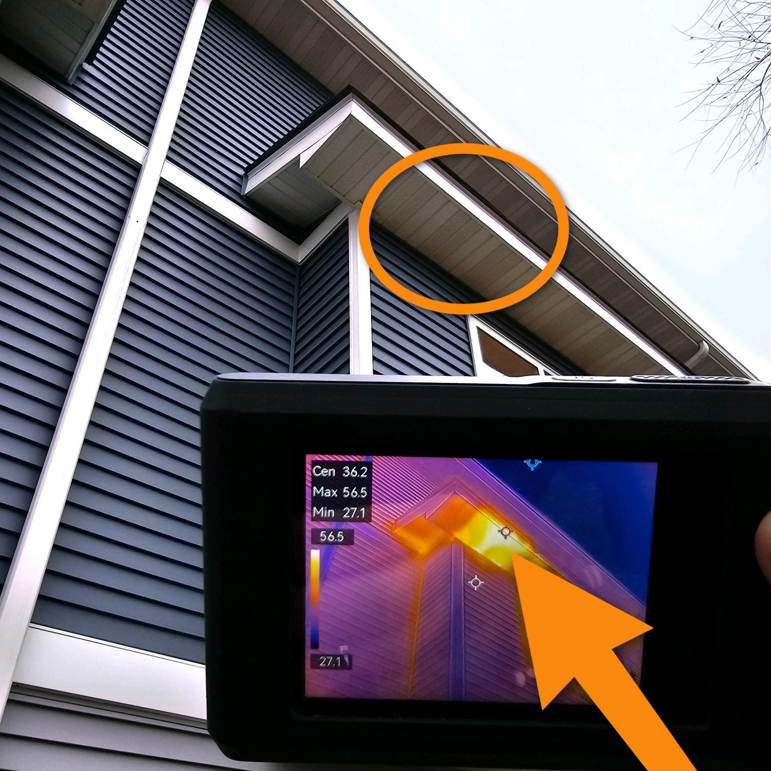 Hidden bath fan exhaust – we couldn’t figure out where the first-floor bathroom exhaust fan was vented, until we used our infrared camera around the outside of the home. Boom! There it is. Bath fans need to exhaust to their own dampered terminals, not into the soffit spaces.