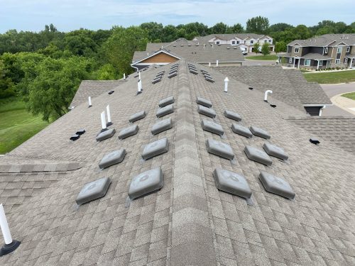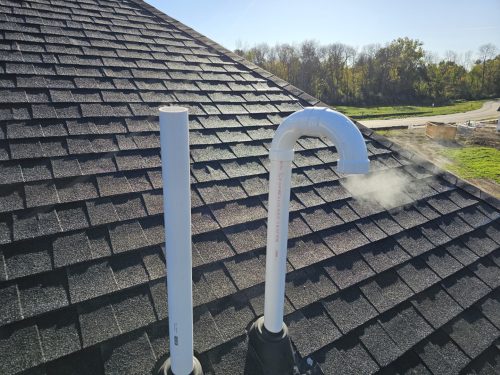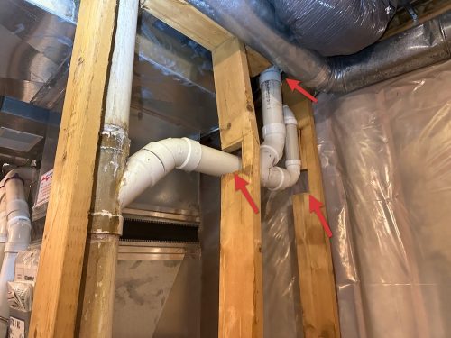 New construction, backward furnace venting – the intake and the exhaust for the high-efficiency furnace are flipped around. The intake needs to point down to help prevent water from getting in, and the exhaust needs to point up. This helps prevent exhaust gas from getting sucked into the furnace intake.
