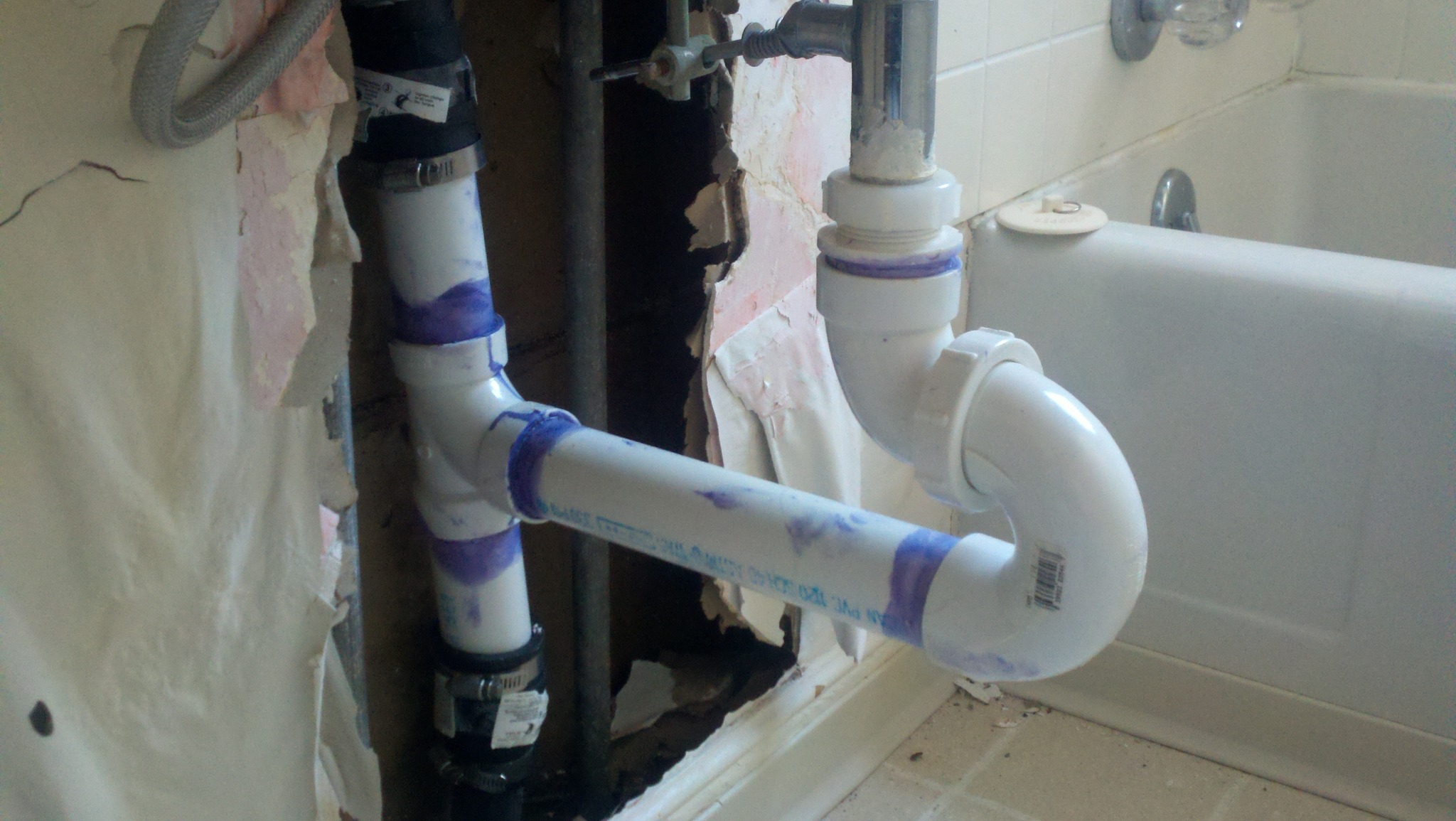 Not a trap – sewer gas will enter the home. Also, the sanitary tee is upside down, and those rubber clamps don’t have metal bands. And there’s a big old hole in the wall.