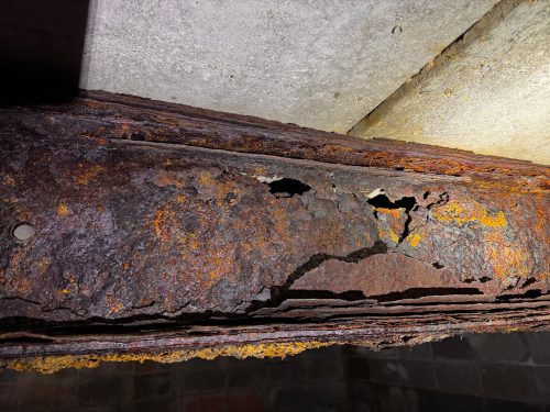 Rusted steel beam – this beam was supporting a pre-stressed concrete floor below a garage. Don’t drive a vehicle in there until the beam is replaced.