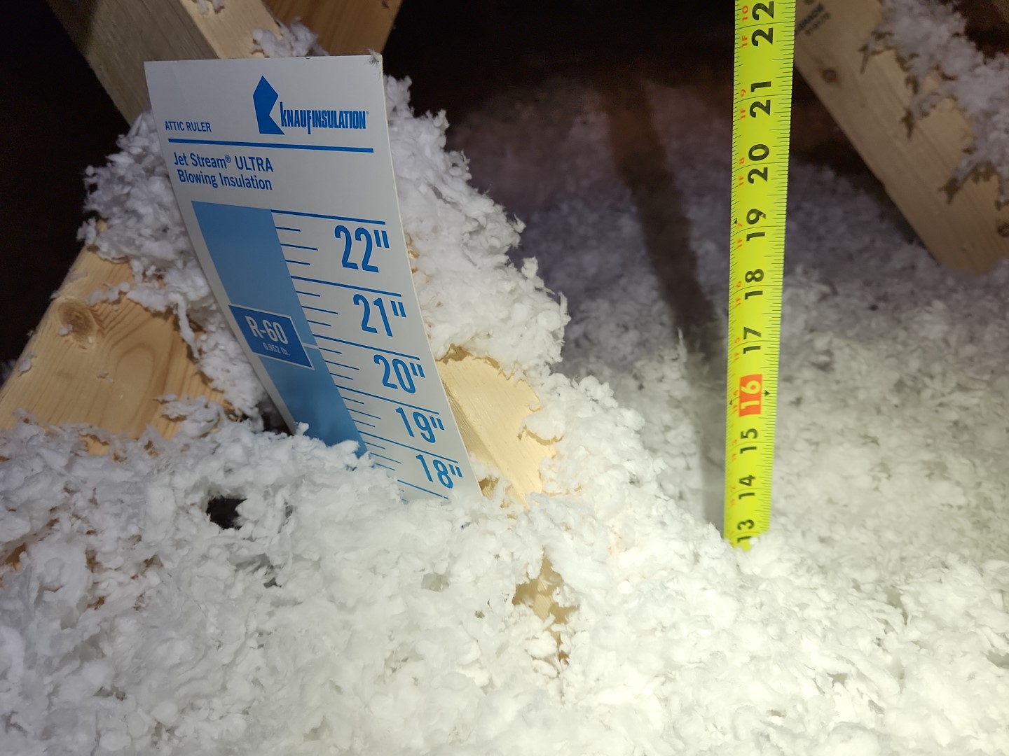 Sneaky insulation installers – they raised the depth marker to make it look like there was more insulation. Again, several people questioned this photo. They suggested that we might have accidentally placed our tape measure on the bottom chord of a truss. And to those people, I say, please give us a little credit. We’re not rookies.